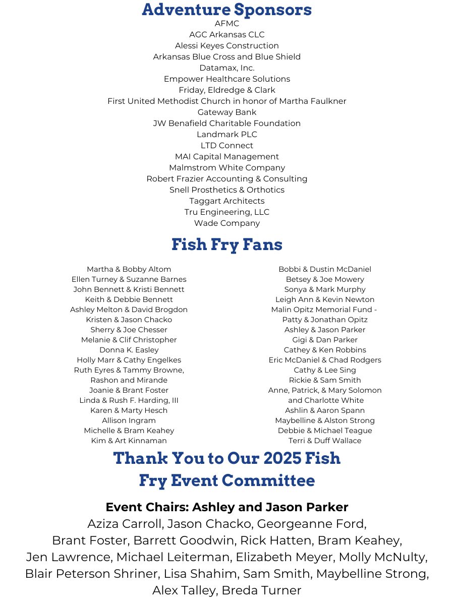 To our sponsors, donors, ticket holders, and community members — thank you for showing up and showing your support. Your generosity helps ensure that Camp Aldersgate can continue providing accessible and meaningful programs for individuals with special needs across Arkansas and beyond.